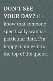 DON’T SEE YOUR DAY? If I know that someone specifically wants a particular date, I’m happy to move it to the top of the queue.